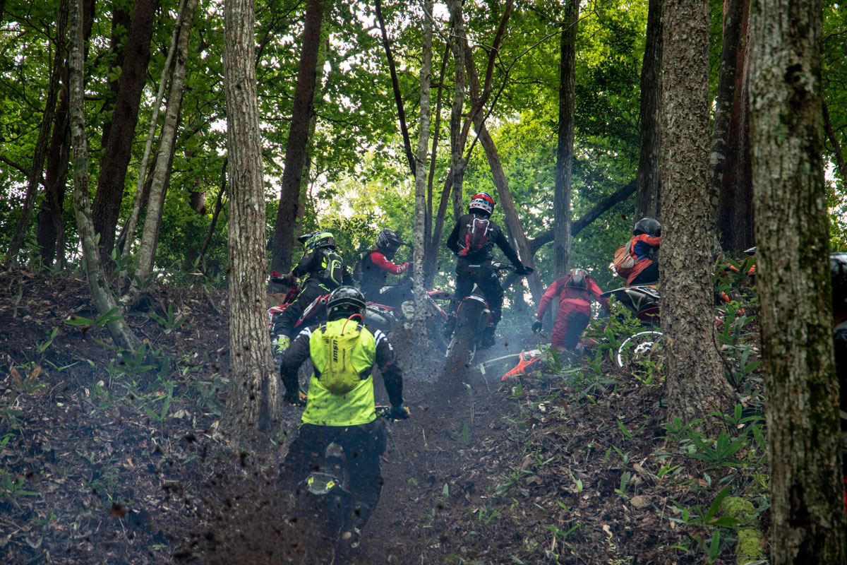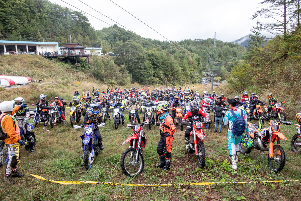 スタートはゼッケン順。G-NETは前年ランキング9位以内が黒ゼッケンライダーとして1〜9のゼッケンを手にすることができる。ランキング順に水上泰佑、山本礼人、鈴木健二、原田皓太、佐々木文豊、永原達也、石井貴行、原真也、中野誠也だ。そのうち佐々木と石井は今大会は不参加。そして黒ゼッケン以外にも有力ライダーは多く、昨年怪我で黒ゼッケン落ちとなってしまった高橋博をはじめ、上福浦明男、泉谷之則、大西実ら元黒ゼッケン組。他にも注目のモトクロスライダーZEROや、トライアルIAの波田親男、ダカールライダー池町佳生ら、錚々たる顔ぶれが揃った。