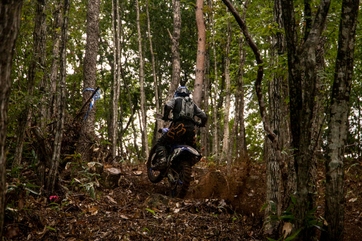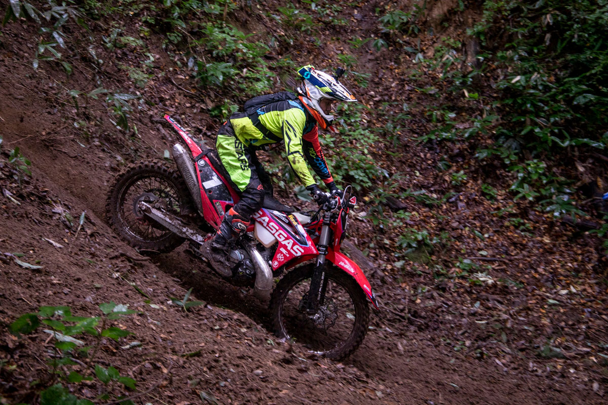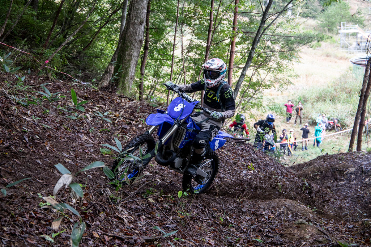 2周目に先頭に立っていたのは、2020チャンピオンの水上。今回からマシンをライバルである山本と同じGASGASにチェンジしている。雨の影響もあり、今大会は下りの難易度が上がっており、レース中にも前転してフロントフェンダーを破損してしまったライダーを多く見かけたが、水上も例に漏れず、この後、下りで転倒した際にキルスイッチに泥が入り、エンジン始動がうまくできず、順位を落としてしまった。