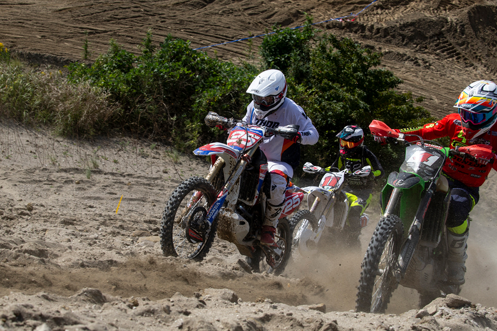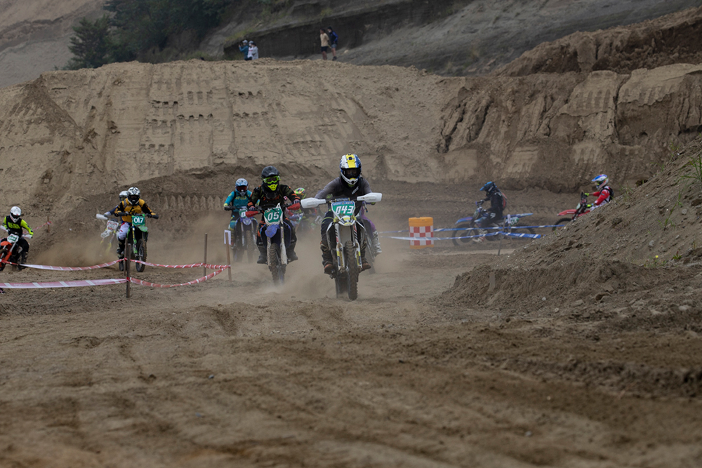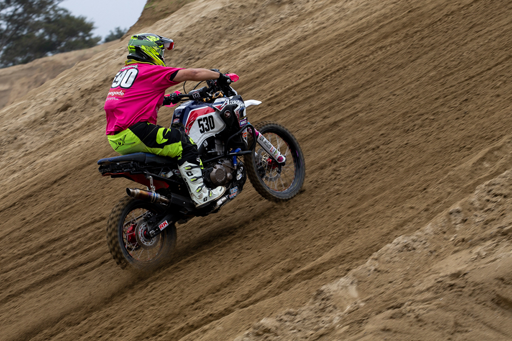 FUNクラスではエンデューロ車はもちろん、多様な車種での参加があるのも見応えの一つ。今回FUN-CクラスにCRF1000L アフリカツインカスタム・CRF1000Rで参戦していた雲島大吾。アフリカツインでサンドコースを走る姿に惹かれた人も多いのではないだろうか。レースについて聞くと「わだちが多くて、コースをすぐに変えられないんですよね。転倒は何回したかわからない」と、コースを乗りこなす難しさを話した。
