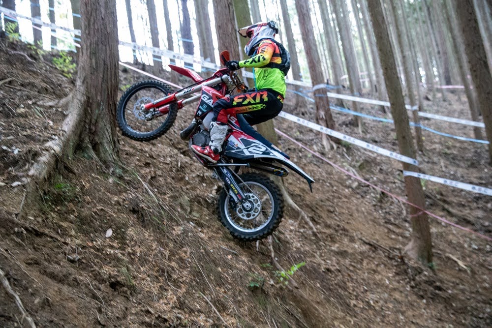 そんなジェホンと接戦を繰り広げていたのは田中だった。正式には選手ではないものの「真面目に走る」と宣言した以上、エルズベルグロデオ・フィニッシャーの面目は潰せない。トライアルをベースに持ち、ハードエンデューロで磨かれた田中のスキルは、いまだに衰えを感じさせなかった。特に下りセクションのスピードではジェホンを圧倒していた。
