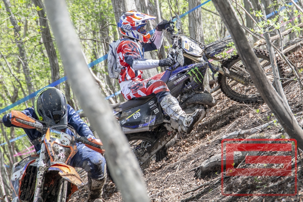 ハードエンデューロでトップを走るということは、前走車がいないためラインが選び放題で一見すごく有利に思えるが、実はリスクも大きい。タイヤ跡がないため危険なラインも判断しづらいし、コースを見失うこともある。