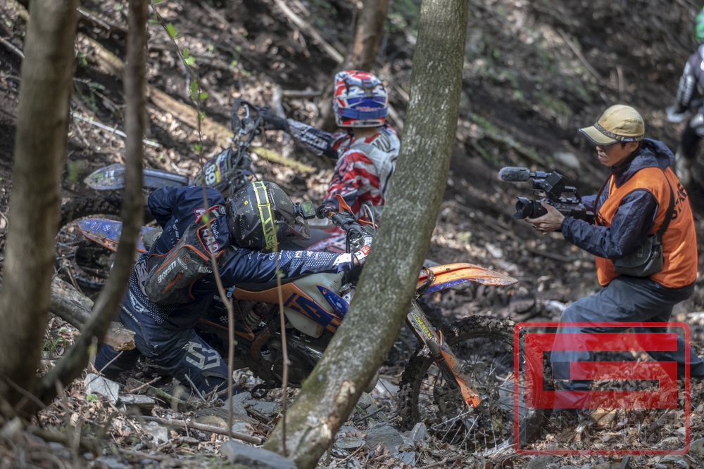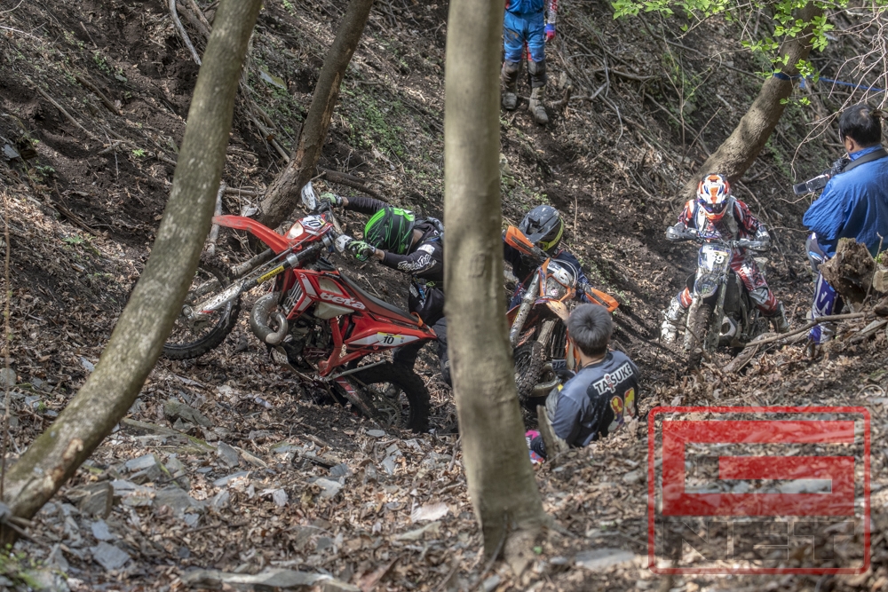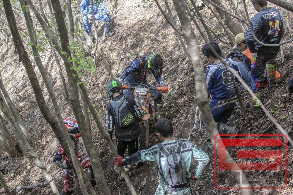 ここでハードエンデューロにおける”Help each other”について補足しておく。G-NETシリーズでは基本的にマーシャルおよび観客がライダーをヘルプする行為を禁止している。ここで言う「ヘルプ」とは「マシンに手を触れる」行為全てで、わかりやすく言うと「引っ張る」や「押す」といった手助けのこと(アドバイスや給油の手伝い、ドリンクの提供などは禁止されていない)。しかし「ライダー同士のヘルプはOK」とされている。何故かというと例えば一人のライダーが一本しかないラインを塞いで立ち往生してしまったら、後続のライダーは誰もその先に進めなくなってしまい、レースが成立しなくなってしまう。ただし、助けられたライダーが助けてくれたライダーを見捨てて先に進んでしまうのは仁義に反するということで、一方的なヘルプではなく、”Help each other(お互いに助け合い)”という精神が根付いている。これはエルズベルグロデオのような世界選手権のトップ争いの場においても同様だ。