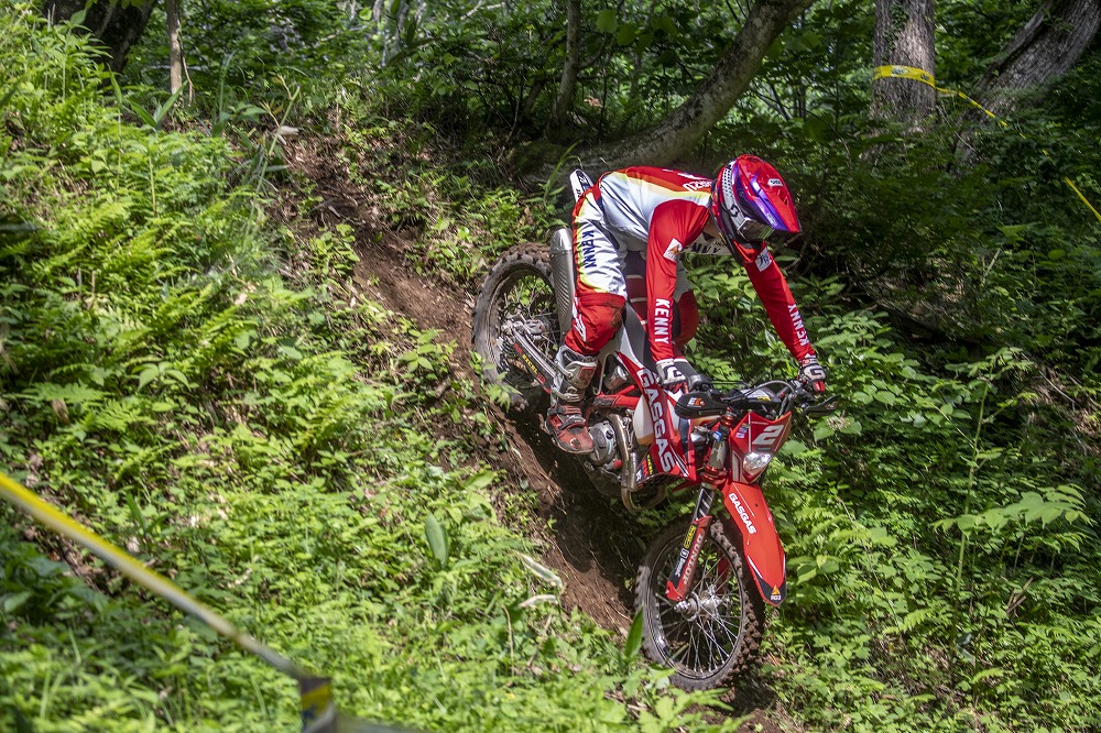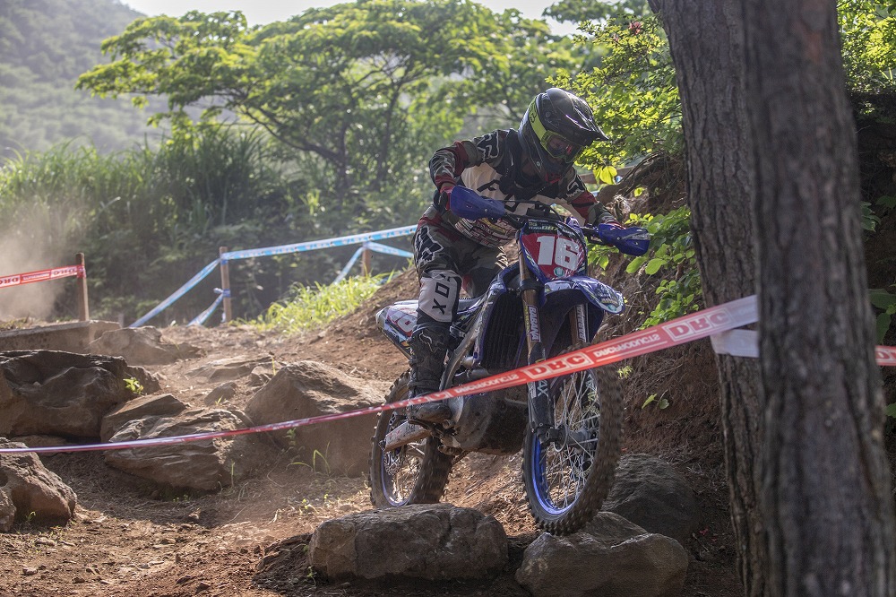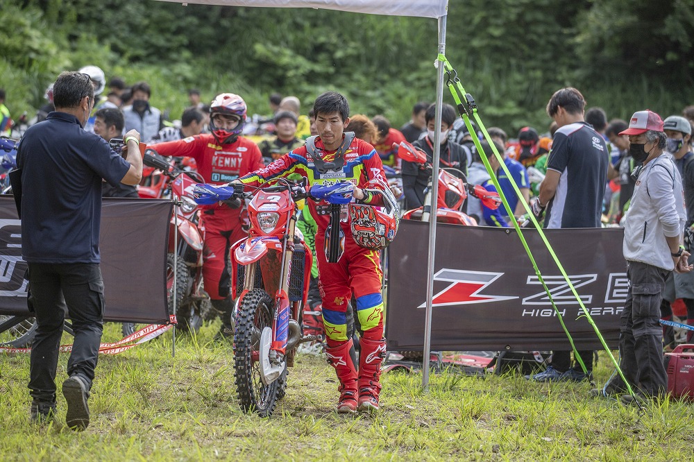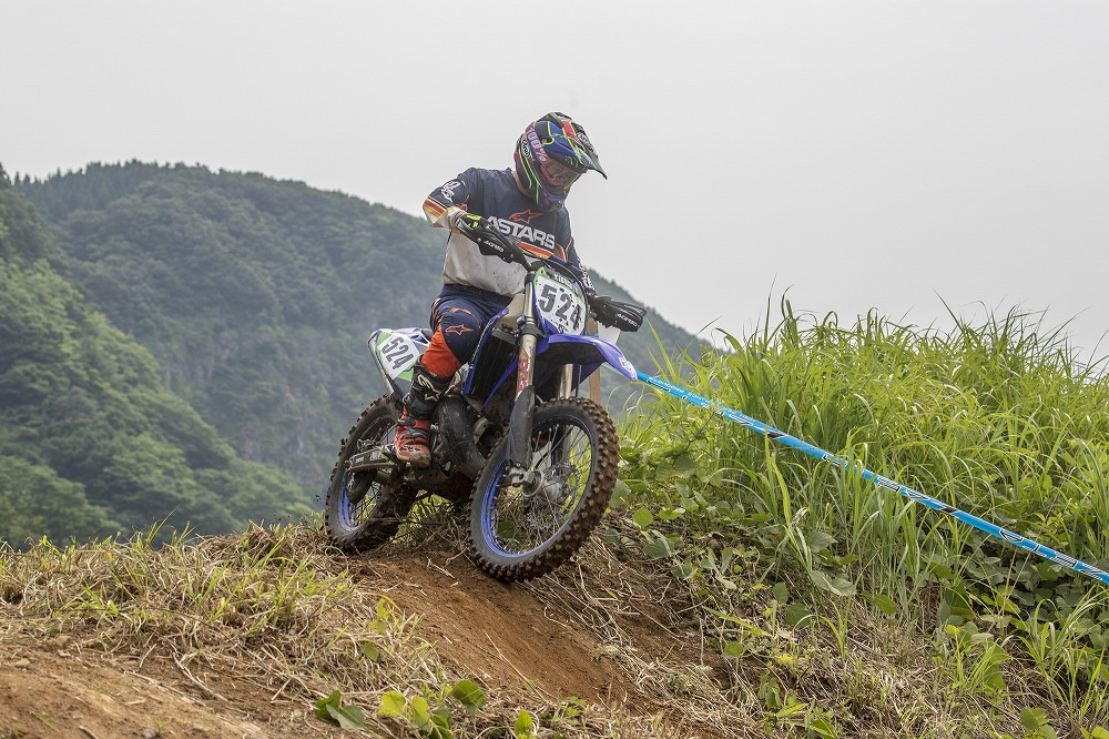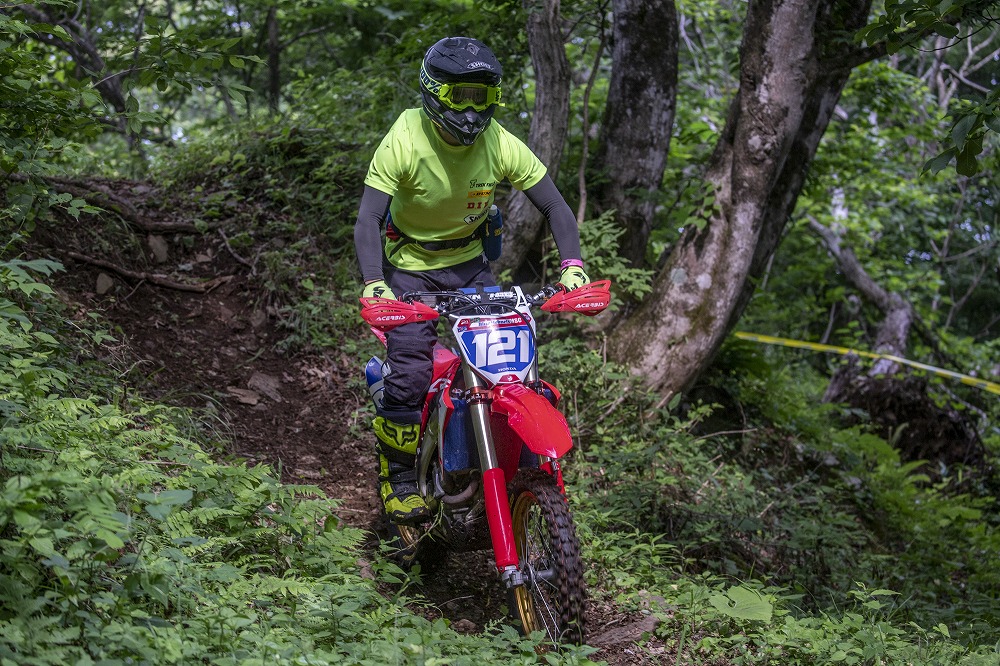 今大会のコースは2日間とも共通で、ルート→テスト→ルートで1周。テストは2.2kmあり、モトクロスコースとウッズを繋いだレイアウト。後半のルートのみIA、IBクラス限定の難所が設けられていた。周回数は全部で10周、最初の1周はテストのタイム計測が行われないため、9回のテストタイムで順位を競う形だ。