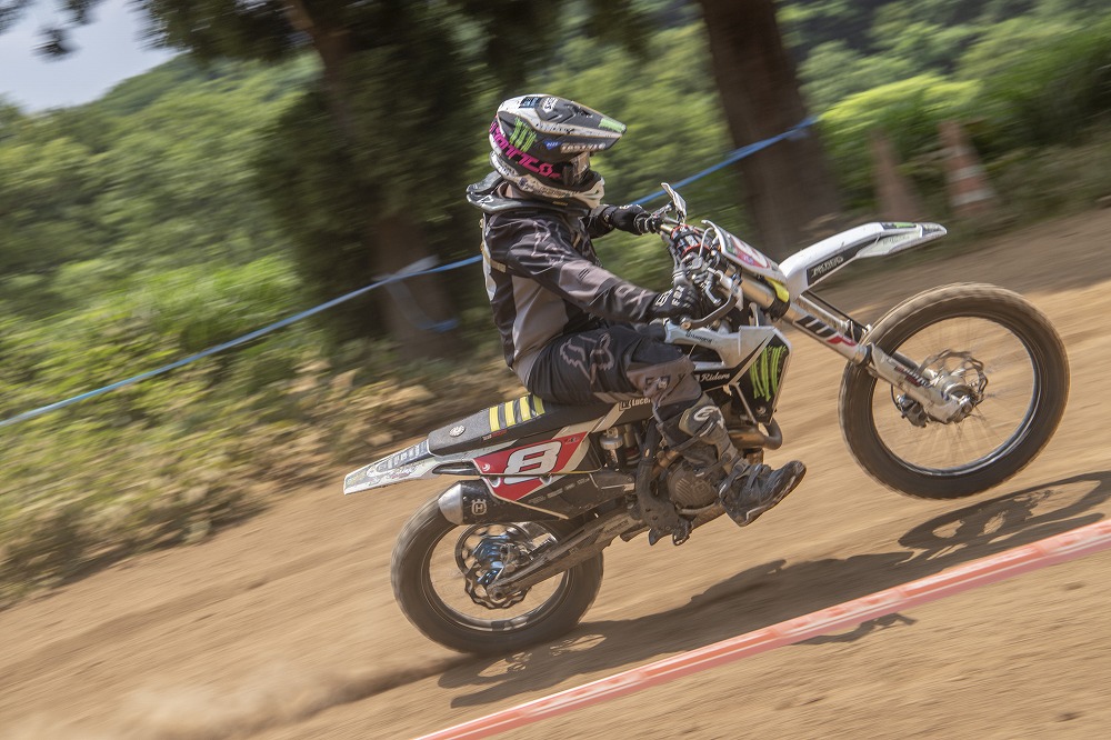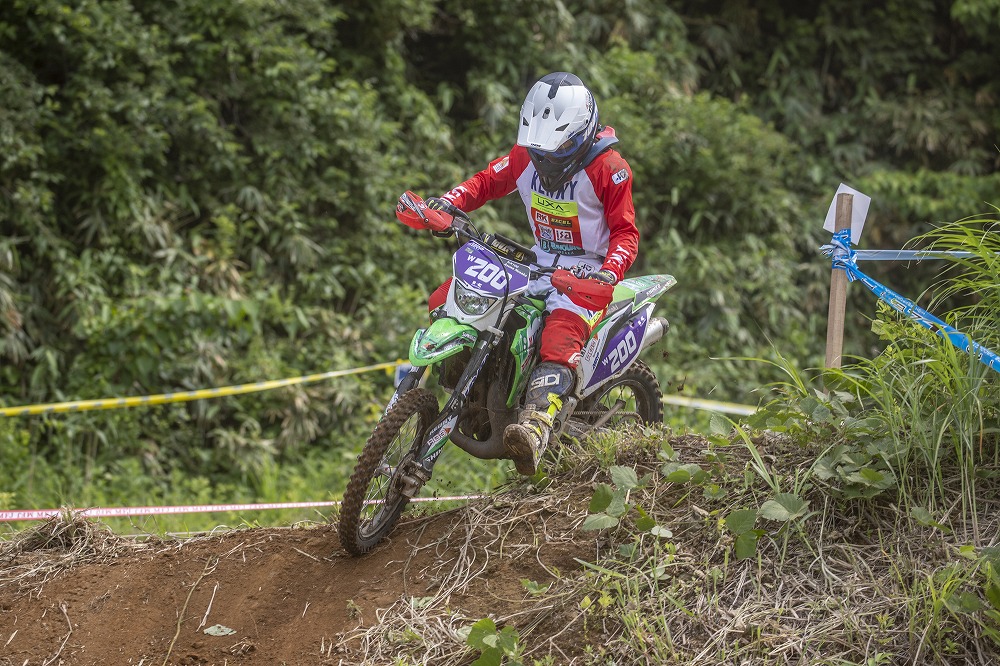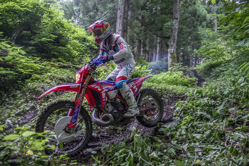 「コスモスポーツランドは、僕がモトクロスの現役時代に中部のモトクロス選手権でよく走っていたコースで、テストのモトクロスコース部分はほとんどそのままのレイアウトだったので、当時の経験を活かすことができました。大きなミスはなかったのですが、ウッズの中で湿ってる黒土の中に石が埋まってるところのライン取りが難しく、フロントタイヤが石に弾かれてハンドルがとられてしまうと、クラッシュしそうで怖かったです。Day2は1周目から昨日のベストタイムを更新したのですが、釘村さんがもっと速いタイムを出していて、めちゃくちゃ気合入れて2周目以降に挑みました。テスト内の湿ったガレの登りが本当に難しくて、昨日もそこがうまく走れなかったので、レースが終わった後にもう一回下見したんです。それでラインは見つけていたんですけど、やはりうまく走れなくて。最後の9周目に全てがカチッとハマって、べストラップを出すことができました。今日の優勝は本当に嬉しいです」